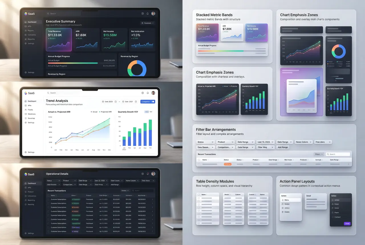 Layout, controls, metrics, tables, charts, actions, and states all work together. Once you read them together, SaaS dashboard examples become far more useful.