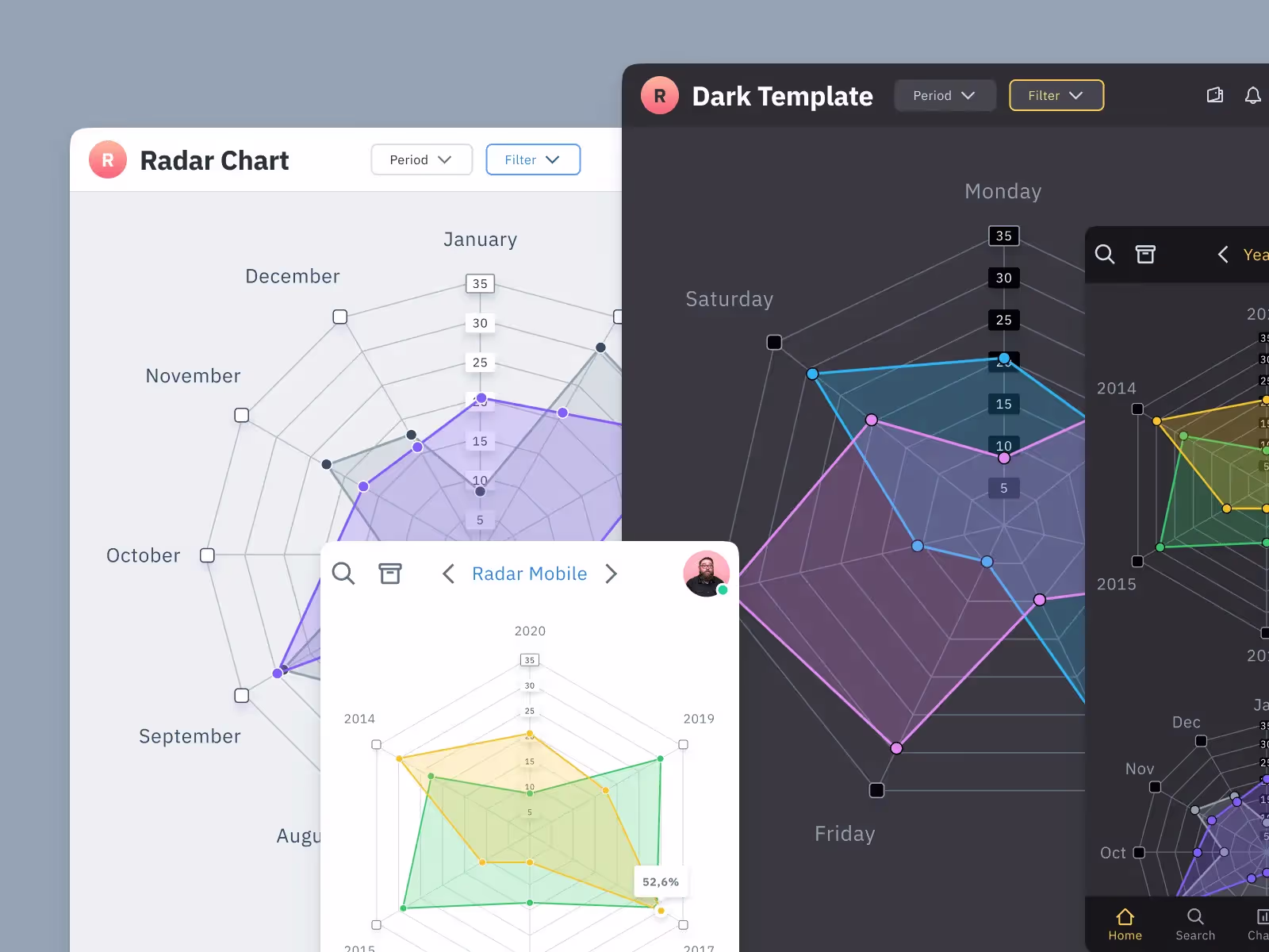 Figma library with 40+ full-width charts templates served in light & dark themes. Contains 200+ of dataviz widgets that look perfect on desktop & mobile screens.