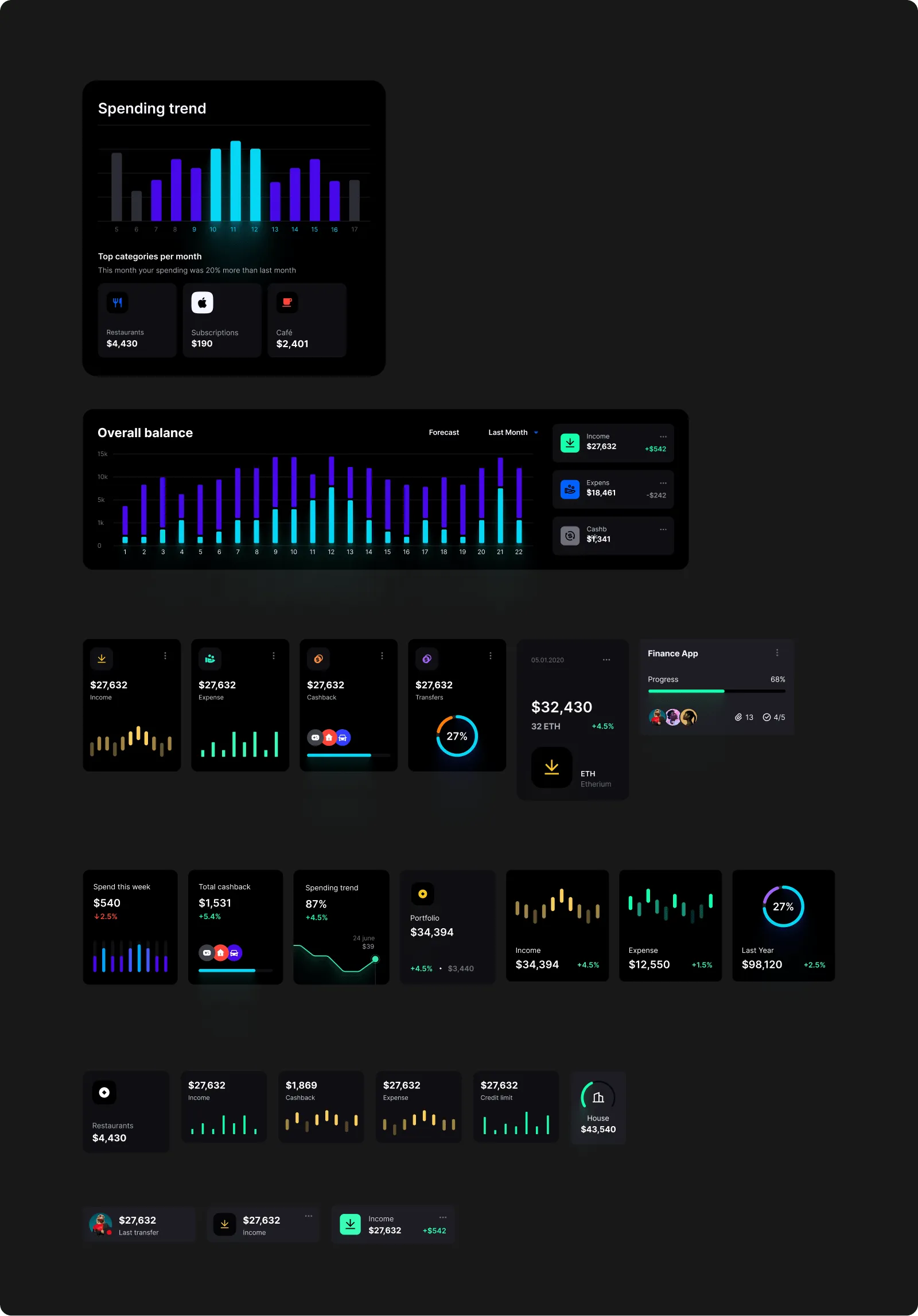 This trendy Figma library includes 80 components with 1100+ variants and 74 dashboard templates for desktop & mobile web applications.