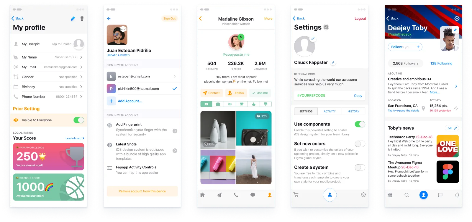 Figma mobile design system with 320 app layouts at the ready. Contains variety of screens based on Apple's design guidelines + custom themes.
